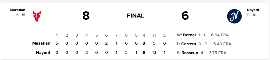 El duelo tuvo tintes de fiesta ofensiva desde el primer inning, cuando Mazatlán desató un ataque furioso que terminó marcando la diferencia. Los primeros dos en la tanda, Alonso Gaitán y Ramiro Peña, se embasaron con sencillos y luego encendieron la velocidad con doble robo. Aunque el abridor nayarita reaccionó ponchando a Juan Mora y Estamy Ureña, el pasaporte a Keven Lamas llenó las colchonetas para que Fabricio Macías respondiera con un imparable al izquierdo que produjo dos. Y por si fuera poco, Andrés Álvarez coronó el rally con un cuadrangular de tres carreras, un golpe directo a la moral local que colocó el juego 5-0 apenas en el amanecer del duelo.