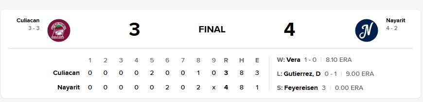 El triunfo fue para Alexis Vera (1-0), quien lanzó un tercio de entrada con un hit y un ponche. J. P. Feyereisen (3) puso a sufrir a la fanaticada en el cierre al llenar las bases, pero dominó al “Conejo” Robles para concretar el salvamento y sellar la histórica victoria nayarita.