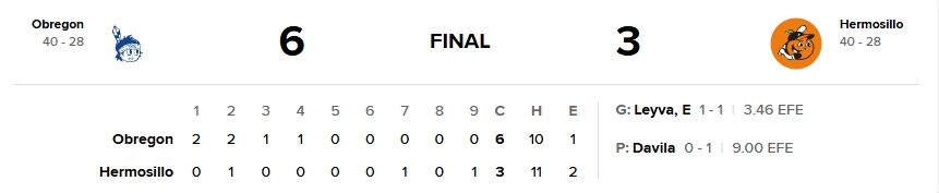 Hermosillo logró hacerse presente en la segunda entrada cuando César Salazar recibió pasaporte, avanzó con sencillo de Edson García y anotó con elevado de sacrificio de Daniel Johnson. Más tarde, en la séptima, Brayan Mendoza llegó a base tras un pelotazo, avanzó con rodado de Willie Calhoun y anotó con doblete de Andretty Cordero al central para acercar a los Naranjeros.